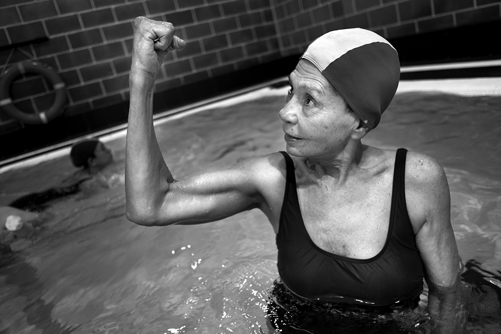 Thanks to the help of homecare, Isabel goes to the gym daily. She alternates swimming and weights, which give her the necessary strength to not lose muscle and thus be able to get up from the wheelchair by herself, always with the help of a metal rail or something similar. "I cannot afford to be bedridden", says Isabel. Barcelona, December 2016. © Patricia Bobillo Rodríguez/////Resiliencia y superación.
